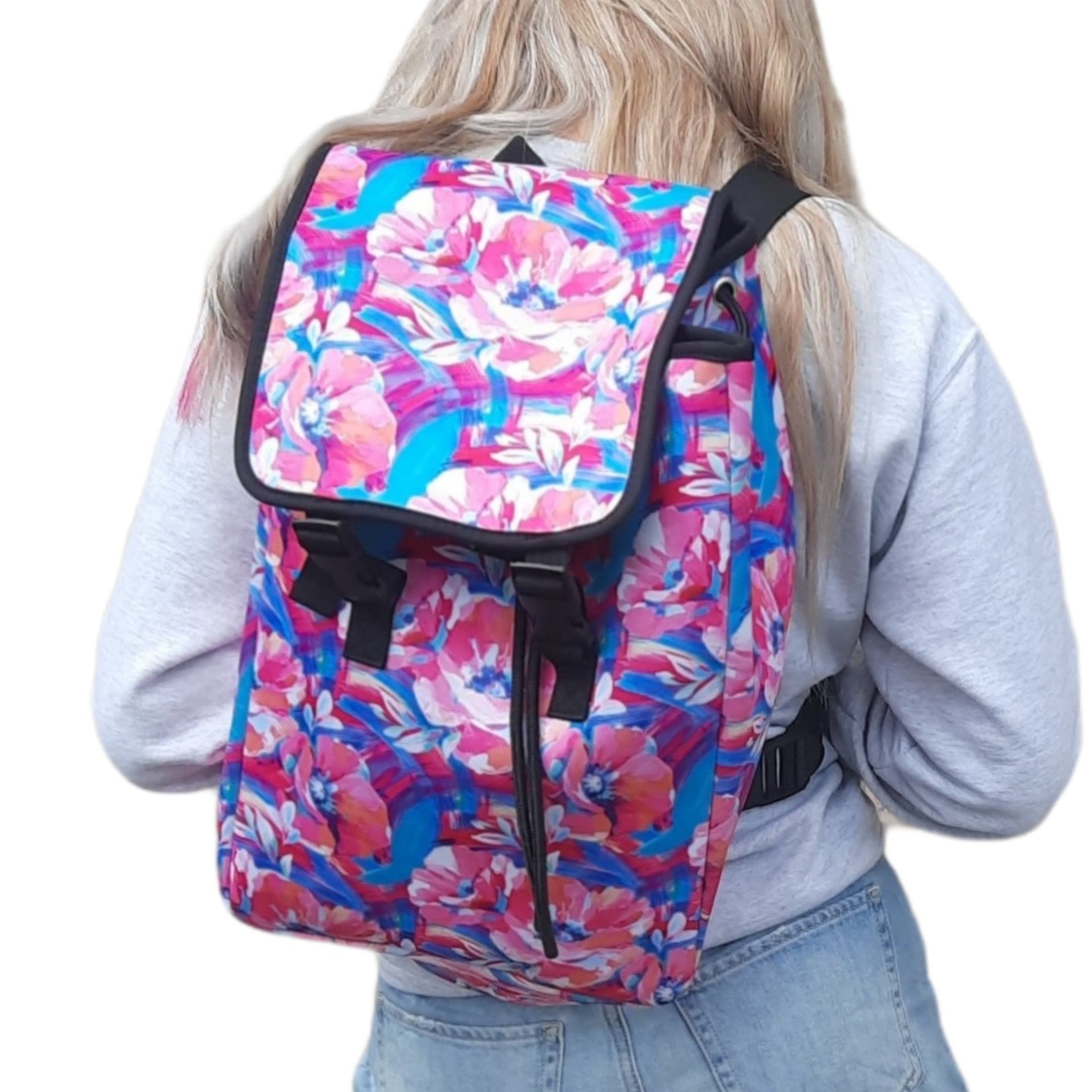 These neoprene backpacks are amazing! Fully opened they are 9D x 12W x 15L. They feature a push button pull string and adjustable nylon straps. Because these are made from 3mm neoprene, these water resistant backpacks do an amazing job at keeping your things insulated and cool.