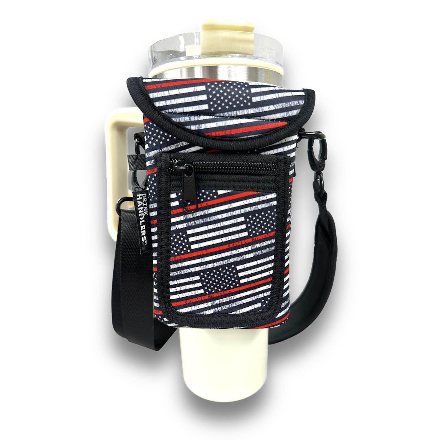 These wrap around pocket Handlers™ have a 6x3.75 pocket that velcro shut and will wrap around bottles and tumblers with a diameter of 3.5 inches to 5 inches. All tumblers pictured are in the 30 - 50 ounce range. They also have a small loop to attach keys.