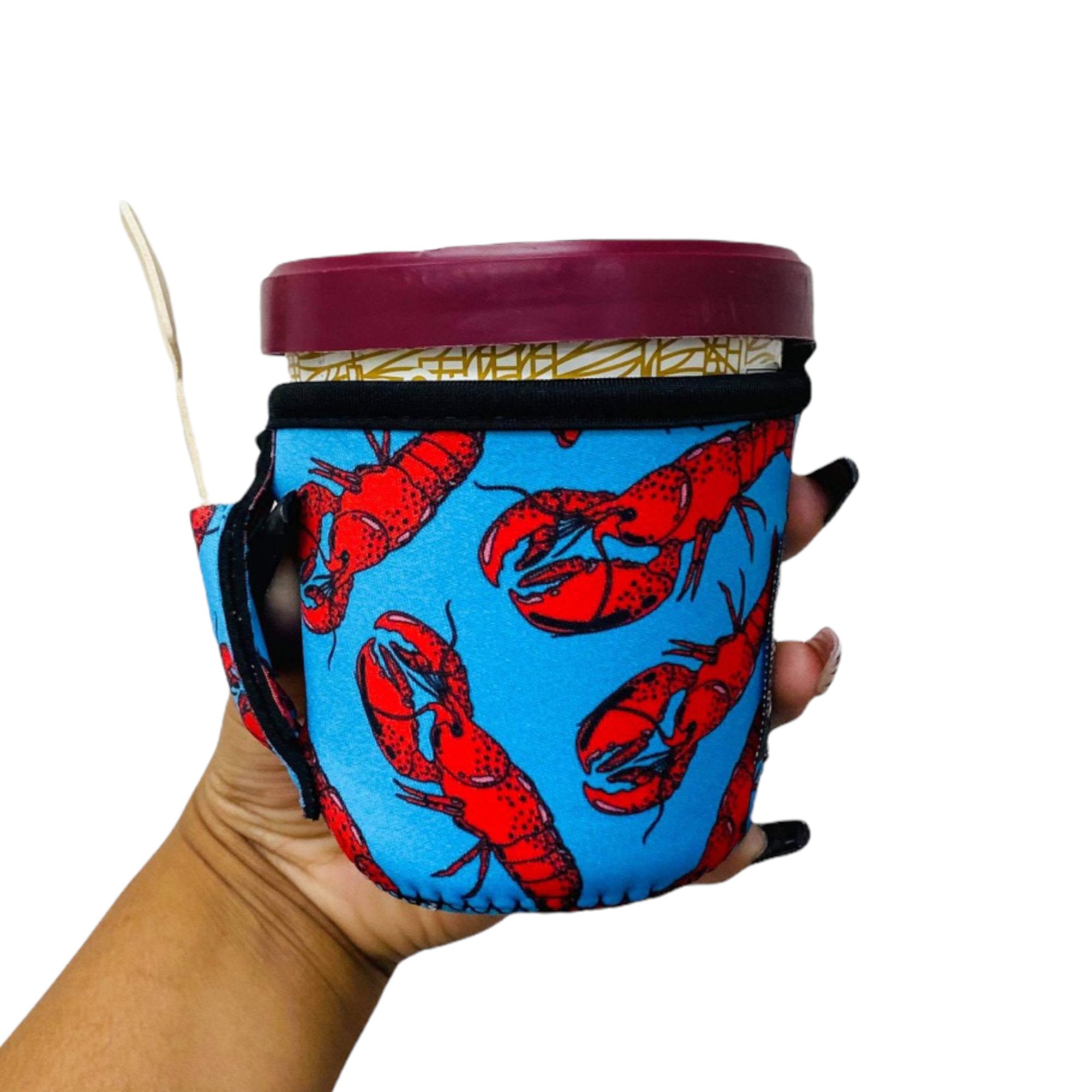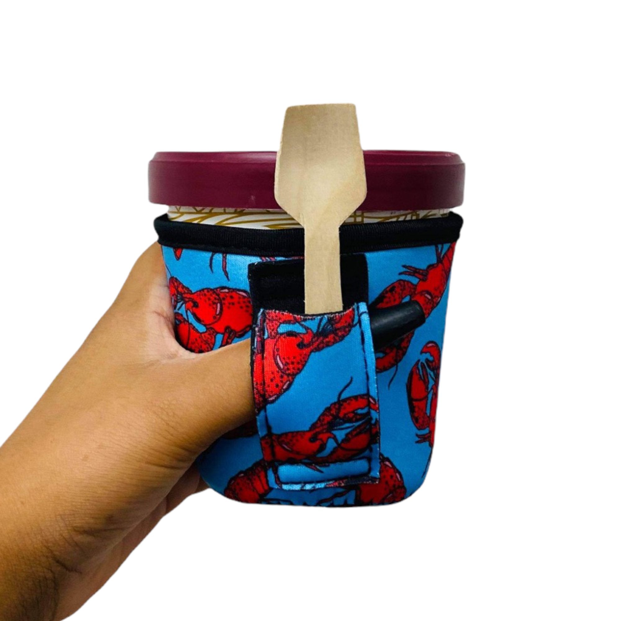 Tired of eating ice cream with frozen hands? Look no more. These pint size ice cream Handlers™ fit a variety of brands such as Blue Bell™, Ben & Jerry’s™, Halo Top™, did we mention Blue Bell™? 😜 These 3mm neoprene Handlers™ also have a pocket in the handle to help hold your spoon if you need to walk away for a minute.